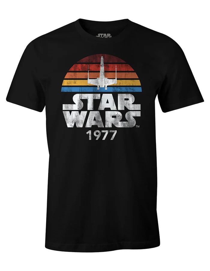 Camiseta de manga corta en color negro con la forma del cuello redonda y el corte acabado en recto. El estampado es frontal y centrado, la serigrafía es de alta calidad y la imagen trata de la saga de la guerra de las galaxias y el año de estreno de la película de 1977. En la imagen podemos apreciar unas líneas de colores con la silueta en color blanco de un caza estelar Ala-X y junto con el título de la película en letras blancas ''STAR WARS''.